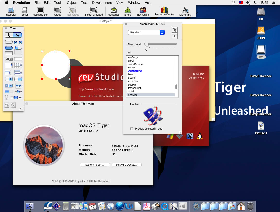 RunRev 4, MacOS Siberian Tiger (10.4.12), with all those blends that LiveCode later dropped: