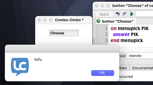 I've been trying to get the user's choice from a combo button into a field. Nothing I tried worked so I tried testing if a simple dialog would work, code...