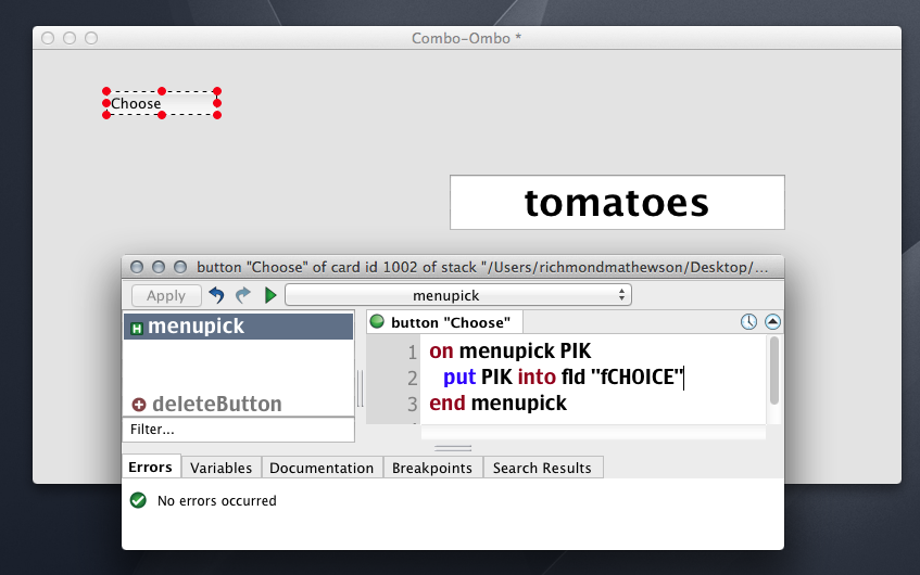 I've been trying to get the user's choice from a combo button into a field. Nothing I tried worked so I tried testing if a simple dialog would work, code...