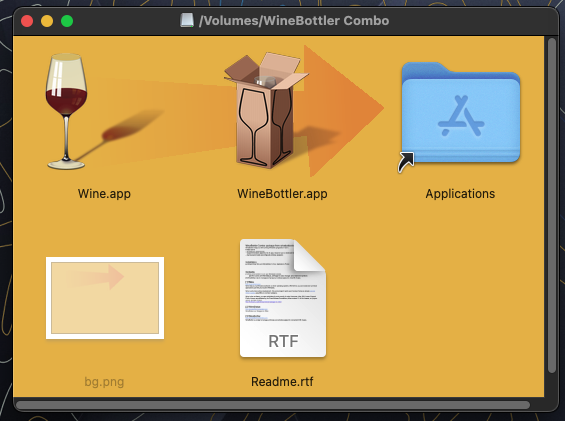 Drag the 'Wine.app' and the 'WineBottler.app' things into your Applications directory.