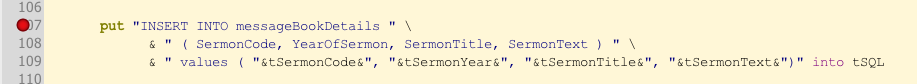 & " values ( tSermonCode, tSermonYear, tSermonTitle, tSermonText)" into tSQL