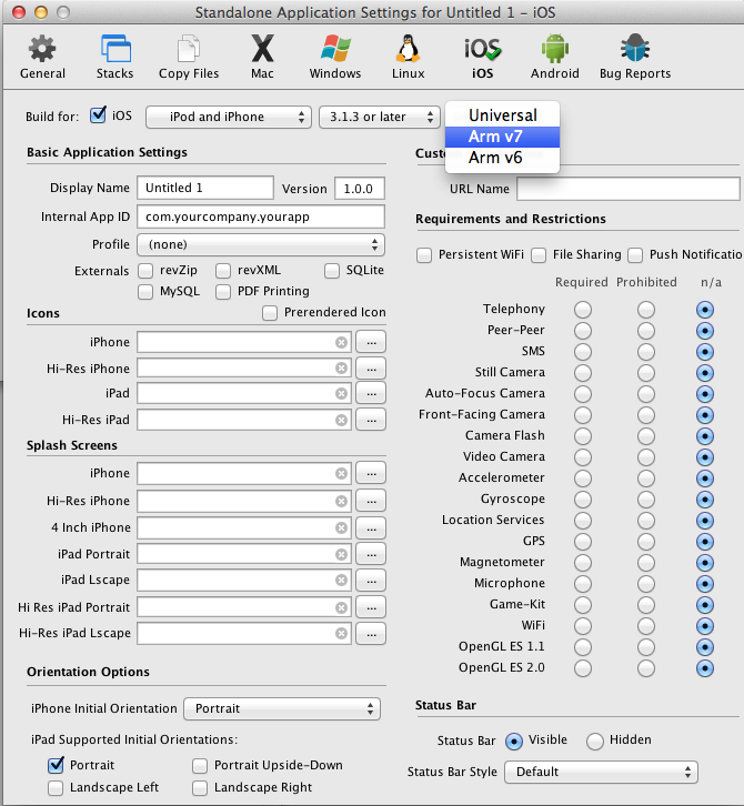 To create an app that supports just Arm v7, change the Build for option in the Stadalone Application Settings...