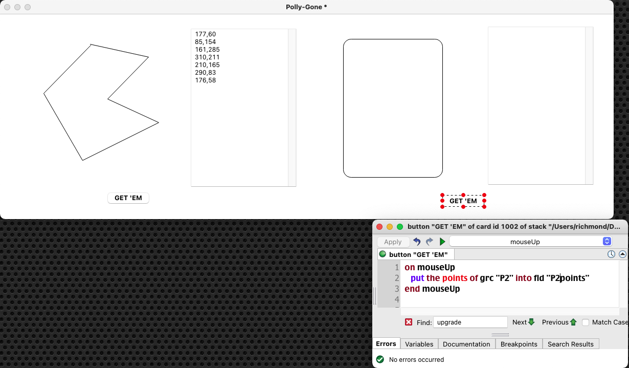 Just as an aside, I fondly remember my absolute favorite tool in SuperCard . . . I think it was called the Shrink Tool. With it, you could assemble, for example, a rounded corner rect or button and a squared corner rect or button and then use the Shrink Tool to collapse a single polygon around around the assembled items. It also worked to expand a polygon inside open objects.