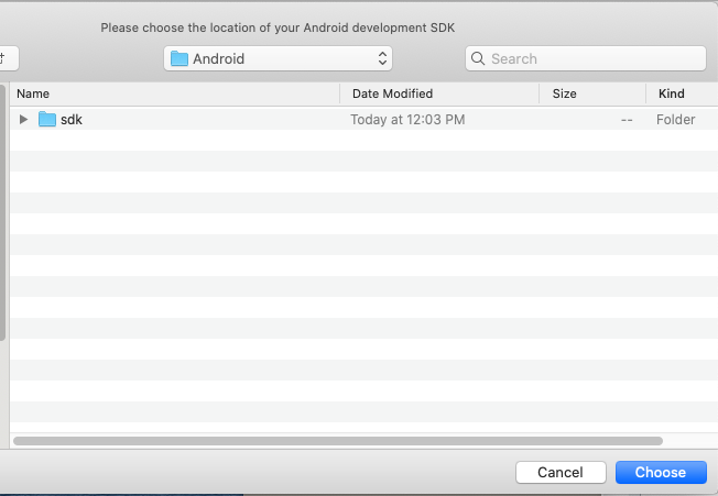 /Users/myName/Library/Android/sdk). Now you should see a list of files in the file dialog where one of the folders is "sdk". Click "sdk" then the button marked "choose".