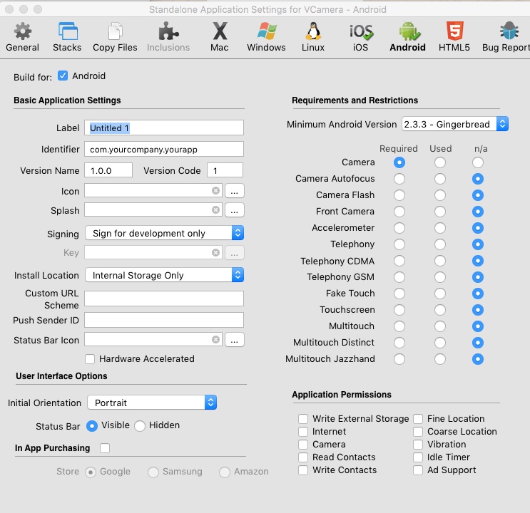 Camera is selected in the requirements for the device but it also needs to be selected in the permissions section at the bottom.