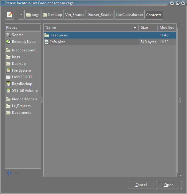 Having failed using that tack, I opened Lc 8.1.2 on the 'nix desktop and opened the reader stack there, since that IDE is *mostly* working on this distro (but still can't save to standalone) thinking I would make sure that it could run on 'nix, so I left the messages enabled. It opened the answer dialog, which I used to navigate to the previously created docset folder, where I chose Info.plist (which seemed like the only choice to make).