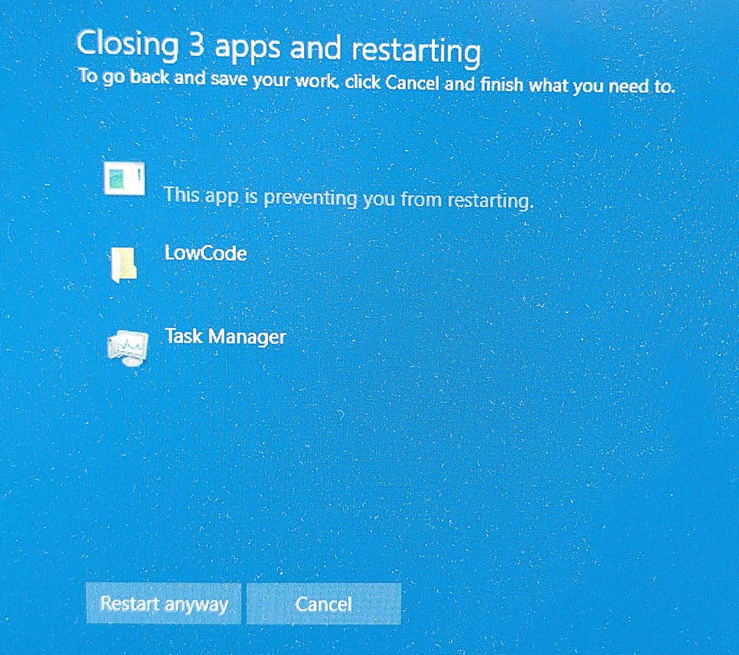 Hi all. This is a problem I've been having on my Windows 10 PC from the beginning of using it with LiveCode. It seems that some process isn't winding itself up after I exit the Livecode IDE, even though it shows as having quit. Later, when I restart the computer, I consistently get the message "This app is preventing you from restarting.", with the folder my project is in (this happens with all projects, not just one specific file). If I restart the machine without having run LC, I don't get this message. Any thoughts?