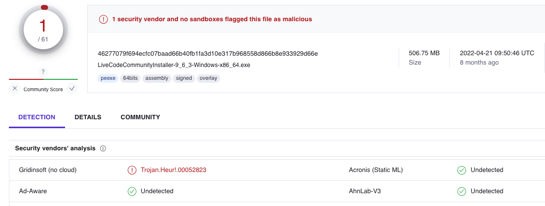 Here's what VirusTotal has to say about LiveCodeCommunityInstaller-9_6_3-Windows-x86.exe: