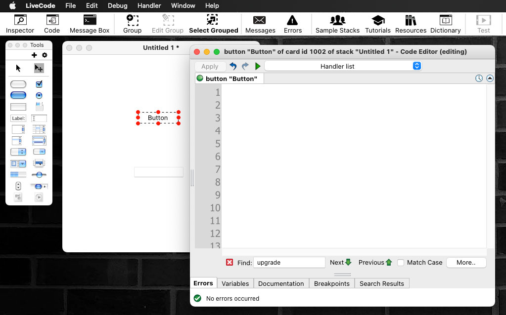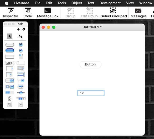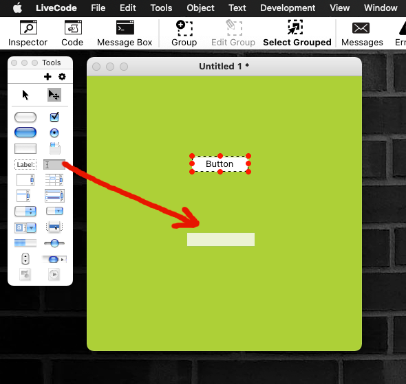 Let's put a BUTTON on our window by DRAGGING one from the TOOLS: