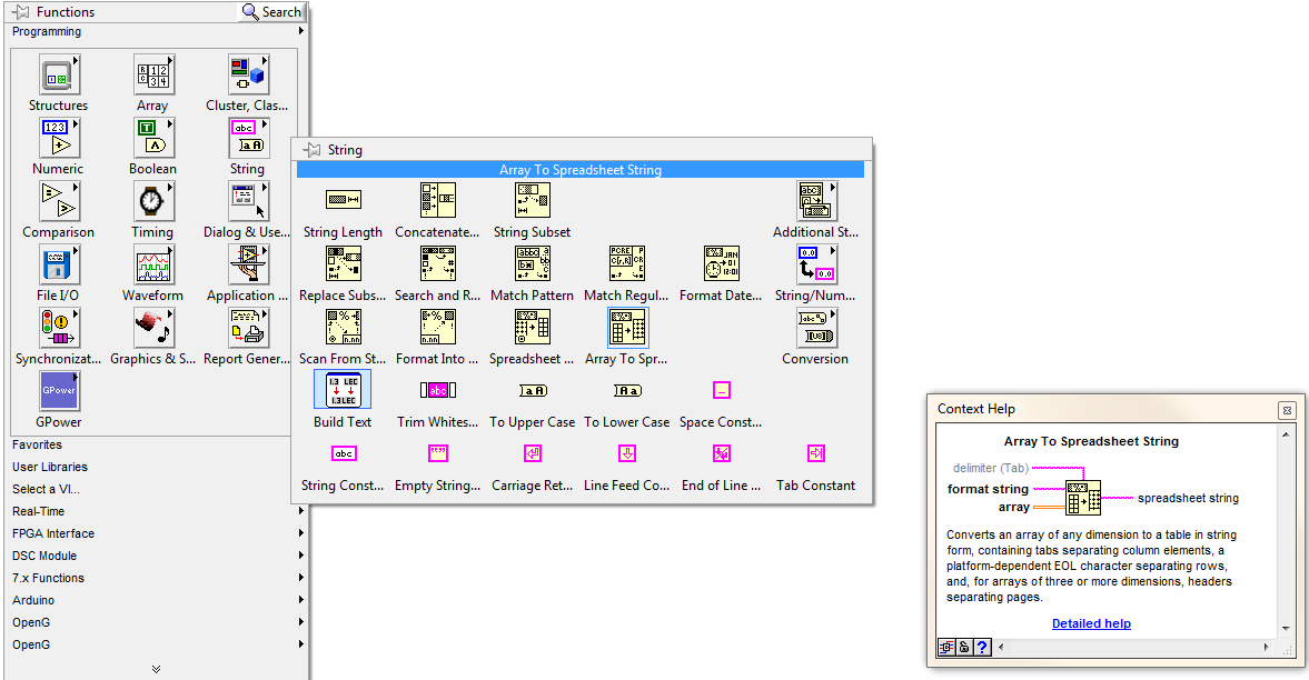 In this case I selected strings and so shown are all commands that can be used with strings, so i placed mouse over "array to spreadsheet" and as you can see in the context help, there is a short description of what that command does.