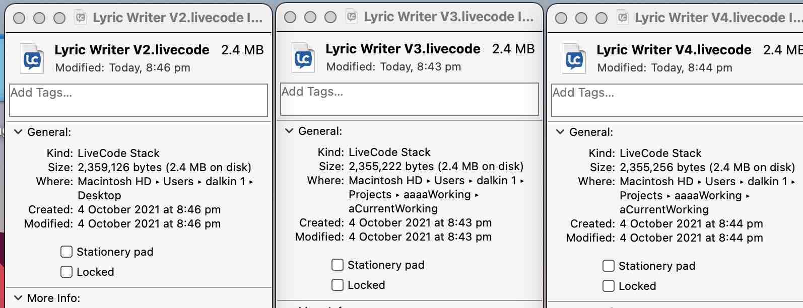 Here's a screen shot showing 3 versions of the same file, saved consecutively but displaying different byte sizes, otherwise identical in every way. NB V2 is the working stack and shows a later modified time only because it was the last stack re-opened to confirm that it is working.