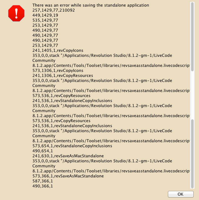 I am trying to save a standalone app using 8.1.2 Community. It's an updated version of a stack created in LiveCode 5.5.5 which I've used constantly for years. The stack runs in the 8.1.2 IDE but I encounter numerous error messages when trying to save as a standalone.