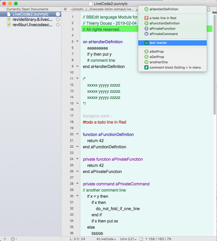 from BBEdit's doc at https://www.barebones.com/support/develop/index.htmljameshale wrote: Is this a mod of the updates to Trevor’s original modules we did for Livecode Script and LiveCode Builder back in Sept 2015?[/url]