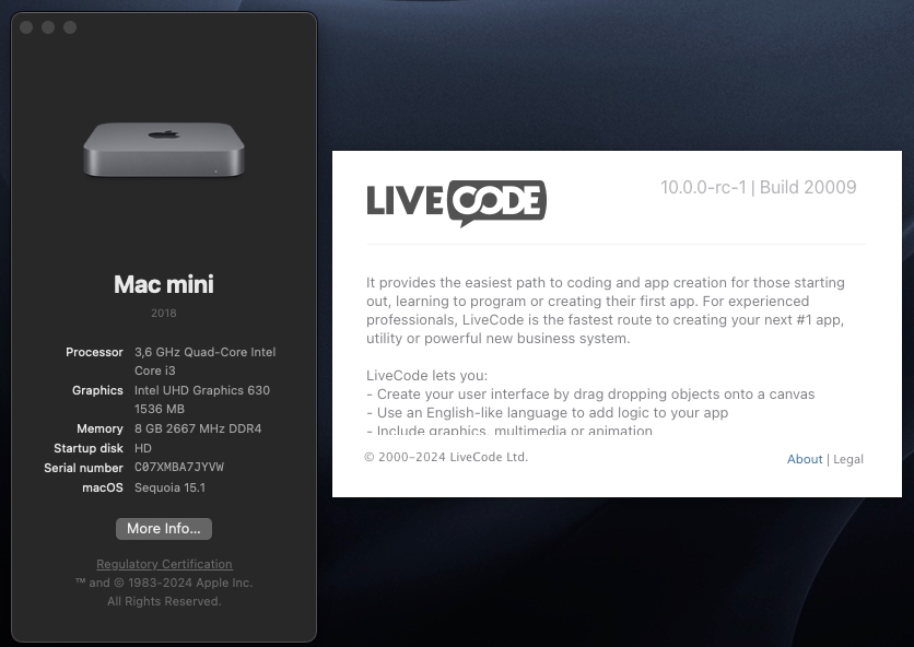 Has anyone upgraded to macOS Sequoia yet? Just wanted to check if Livecode 9.6.13, 10.0.0 RC-1 and Create 1.0.0 DP-2 are compatible with the latest OS? (Was hoping one of you would have tried it