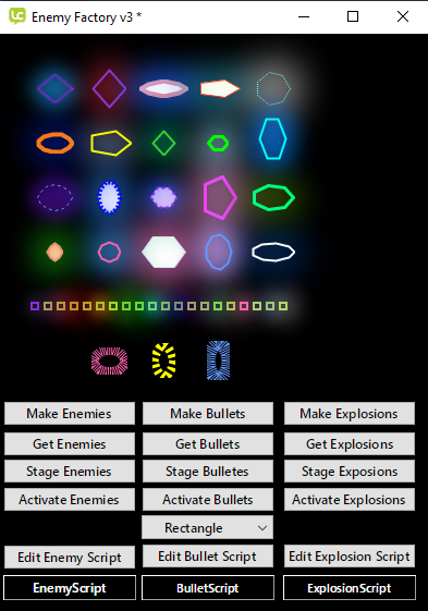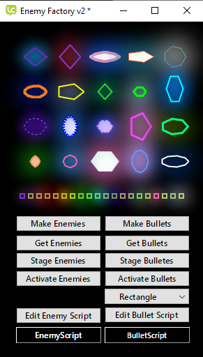 The enemy scripts call ActivateBullets from the main stack script so I added the enemy bullets in the stack along with their scripts and everything works mostly just like the Missile Factory, only we don't test/adjust bullet speeds since they are randomized and rely on the player to target...hmm, might have to make the Enemy Factory bigger to test against a "Player" object. But for now these are the elements: