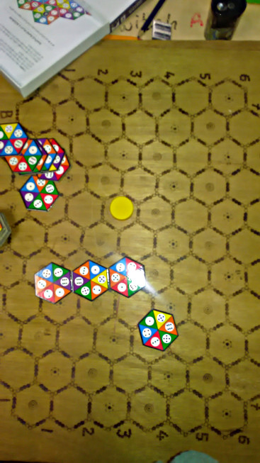 AND here I am, this morning, explaining to some kids about Hexago Continuo and, accidentally on purpose 8), I put the pieces on top of a home made hexagonal chess board I made about 30 years ago.