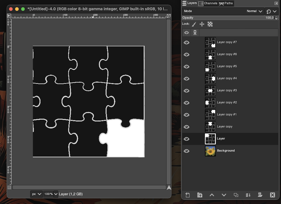 Opened both in GIMP (Still using GIMP 2.10 as version 3 is still 'not') and layered the jigsaw above the sunflowers;