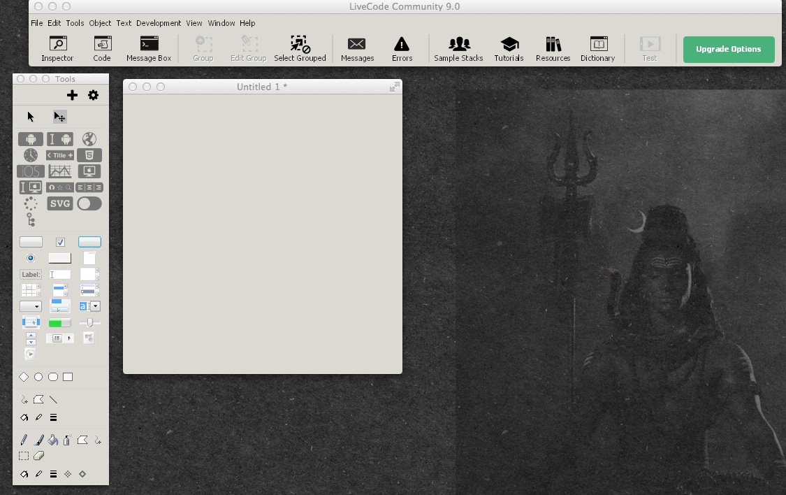 Here's the Windows version of LiveCode 9.0 running via WINE on Mac OS 10.7.5