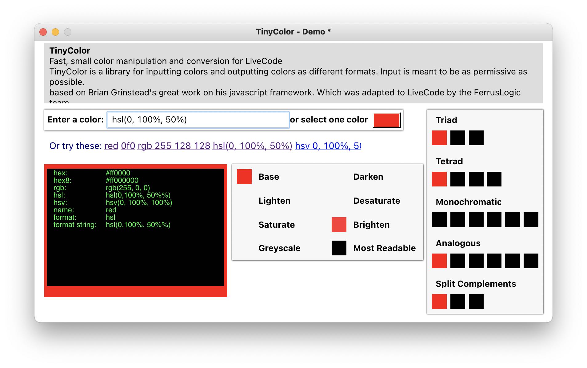 We now have a version of this popular library for LiveCode. Written 100% in LiveCodeScript. You can download the code at https://github.com/Ferruslogic/TinyColo ... ag/v1.0.0b