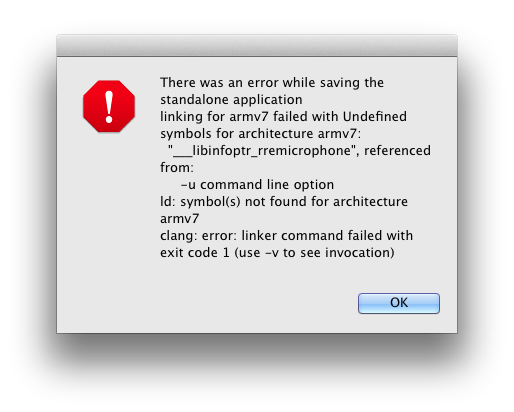 "linking for arm 7 failed with undefined symbols for architecture arm7 "__libinfoptr_rremicrophone" etc." (see attachment)