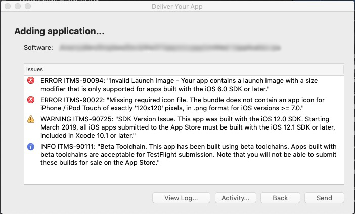 I am trying to build a rudimentary test of an app for testflight deployment just to see how it works. Try as I might, I can't get beyond the two errors (ITMS-90094 and ITMS-90022) after the app delivery. I added icons and splash screens for every size the app uses and the iPhone icon is 120x120 rendered with Asset Catalog Creator Pro. One thing that's interesting is the warning on the Beta Toolchain. I unchecked that in the Standalone Settings just to see if that would make a difference. It didn't. This is my first deployment on iOS. I'm open to suggestions.