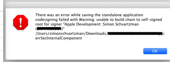 In the dropdown "When using this certificate" do you have "Always trust"? If yes, change this to "Use System Defaults". This will cause the blue cross to go away. When you do that for all these blue cross certificates, try to build an iOS standalone again.