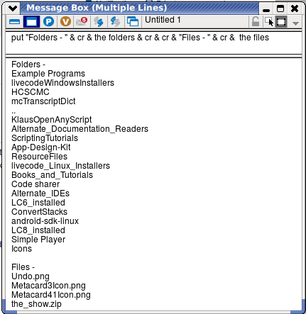 put "Folders - " & cr & the folders & cr & cr & "Files - " & cr & the files into field "Field"