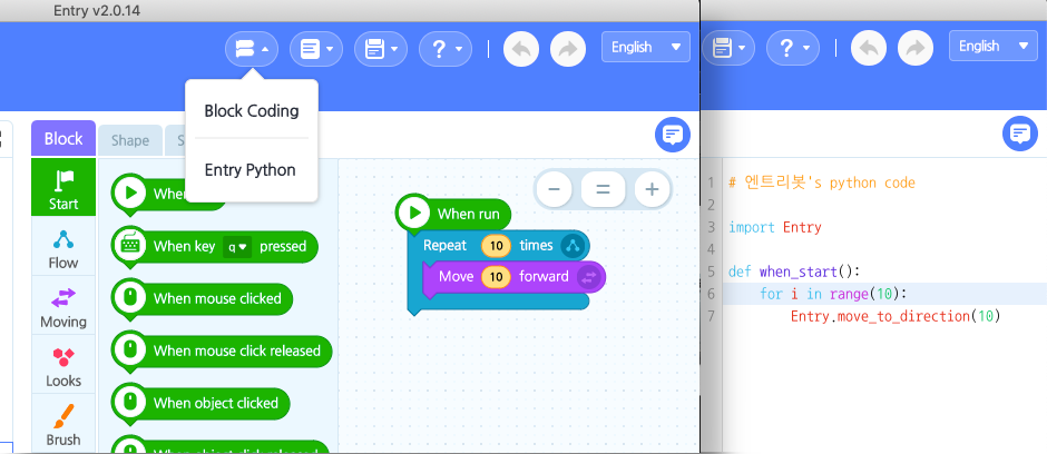 "'Entry Python' mode acts as an intermediate bridge from block coding to text coding. If you have learned the principles of software through block coding and have become accustomed to logically solving problems, then you should try Entry Python mode.