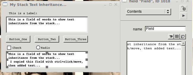 Here is a picture with the defaults in place and 3 controls. Once you set the text formatting of the stack, all of the controls automatically inherit that as Klaus pointed out, as well as any new controls you add. The exception will be the Title bar for the window, it will have the font and the size is determined by the OS setting. Next, let us say that you wanted to make the field text bold, but retain the font of the stack. Clicking on the control, in the text formatting area, simply click on bold. When I am setting up my design, I normally just drag one of each control out and make sure it looks how I think it should, then if I need more of that control, I ctrl/click/drag it to where it is needed, or copy/paste it, however if you wanted something like that you could just make a template control with the changes desired as well.