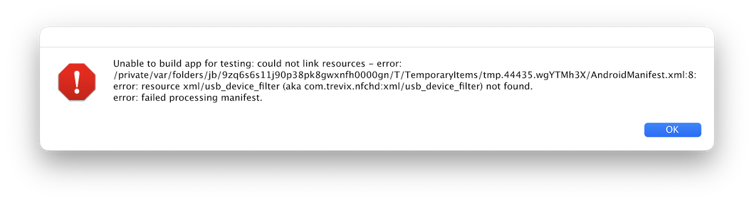 I tried to put a "usb_device_filter.xml" file on the "res" folder of the extension and on the Android runtime of LC10, also modifying the runtime Manifest, but I get an error when trying to install the test stack (see attached image).