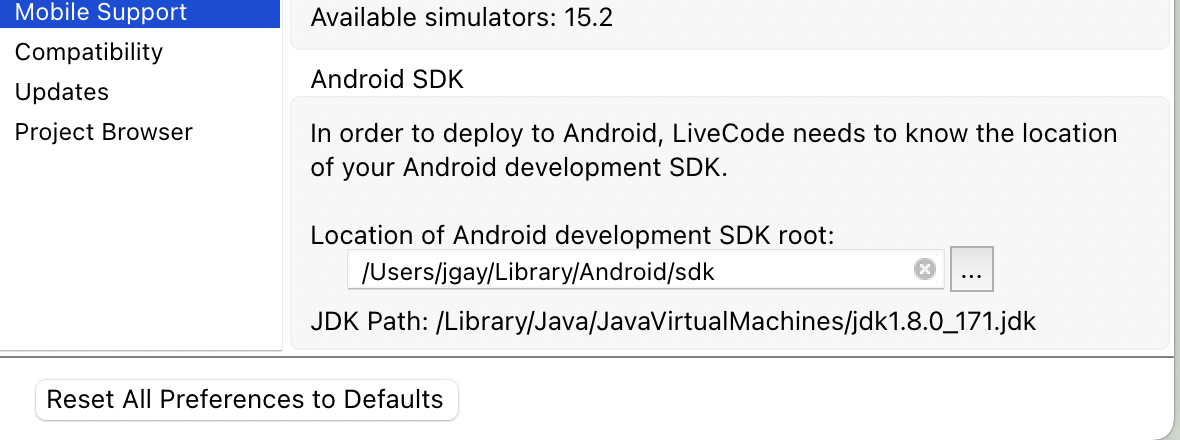 Also, in the Livecode mobile support preferences pane, there is a title for JDK path, but no box below it, or no way to scroll down to see a box (it would be hidden off screen). Am I missing something there.
