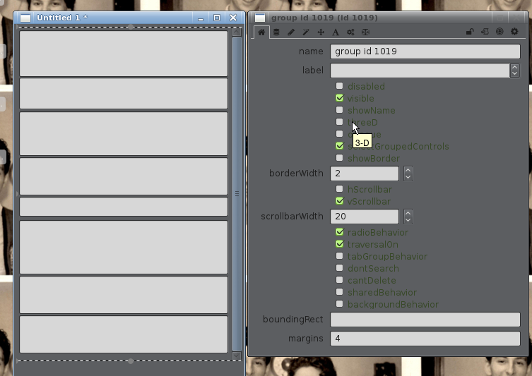 Having said that, your first picture shows fields without scrollbars, inside a group that has a single scrollbar, which tells me the fields are not individually scrolling as your second picture shows. That is easy enough to accomplish, anyway, just remove the vScrollbar from the fields. As to the borders around different objects, there are a number of ways you can reduce or even eliminate that. Take off the 3d setting would be one... ...which would reduce the depth illusion, or just remove the border altogether (one lower), or reduce the width to 1 px. instead of 2 that is the default. Aside from those suggestions, you could also change the border color until it blends right in. Just some thoughts.