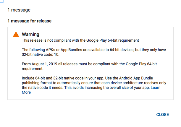 I got the warning message when I uploaded test app. I says " This release is not compliant with the Google Play 64-bit requirement.~"