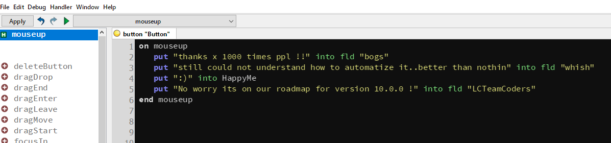 * In this case, the stack was the mcTools stack, I couldn't edit it in Mc since it included passwords not allowed in the community engine which threw errors causing the script editor to not work, and I couldn't do anything with it in Lc as well as of course Lc throws a fit when working on stacks the IDE has the same internal names for (I understand the reasoning behind this, but Mc really did make this much easier to deal with at the risk of blowing it up completely, which I did many times Image).