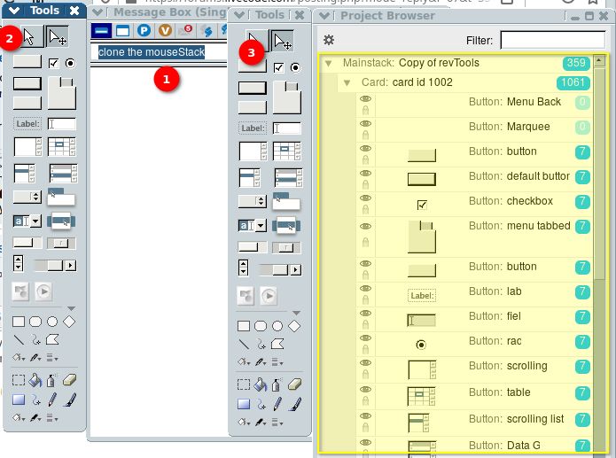 In the above, the tool stack on the left (2) is the original, open the message box and type in the command, move the mouse over the stack & hit enter/return (over the right shift key), and presto bango you have the stack in a safe to mess with way. You can study it as is, or save it to study later.