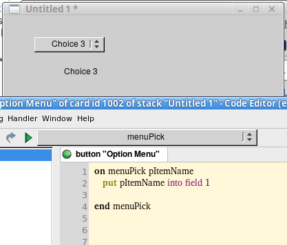 I have a stack with 4 controls on it - A Choice Menu, a Label Field to display its contents a PopUp Menu and a Label Field2 to display its contents. The following script is in the script for the card itself: