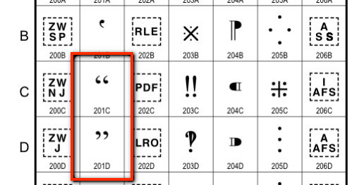 The chars "quote", "beginning quote", and "end quote" seem to be three different things, and apps seem to encode the keystrokes differently.