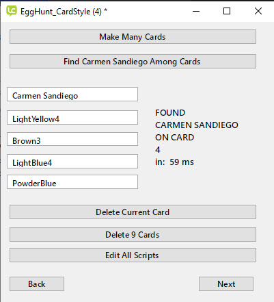 Here's an Example stack. It creates a requested number cards and dumps random colornames into fields across all cards to simulate a very busy meeting maker, asks for a name, then you can go searching for the name, with a script of course.