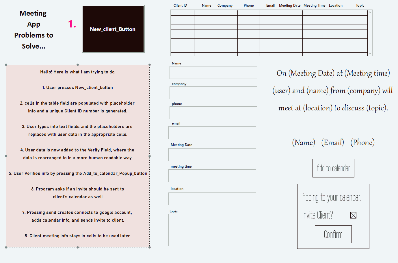 After I finished up with my design classwork today, I made a mock design to show what I envision the data structure for the app. Please feel free to tell me why another approach is better if you can think of a more elegant solution, but it would be nice down the line to be able to back up the info into Sheets. It seems like sharing examples is the thing to do so here is my idea as a gif and a single card stack. I figure I can work on the idea over the week, solve how to do it here and at least there will be some documentation for the next guy. I am only aiming to fully understand and work out steps one through 6 this week, and I hope after I learn that the calendar and invite stuff to follow.