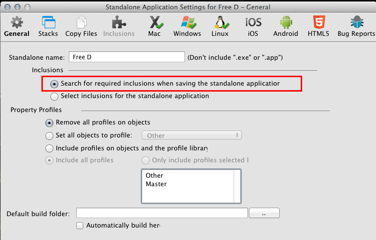 Samuele, you need to add inclusions manually. If you use the automatic inclusions, LC will scan the scripts of the splash stack, which doesn't have much code, and it won't find anything. There's no way to tell the standalone builder to scan a stack that isn't the one used for the app. So you need to do the Inclusions yourself.