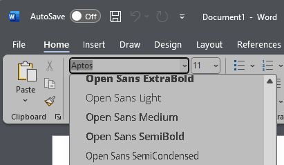 As previously downloaded open sans from google, open the static fonts, selected all and right-clicked to install.