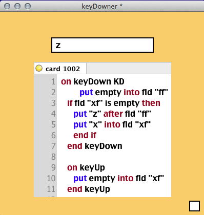 I don’t mean for anyone to spend precious time troubleshooting my sample code. Still, if out of curiousity you’d like to try out a basic version of the test and witness first-hand that the first problem (a long keyDown) was resolved, whereas the second (a quick double keyUp) has not – and possibly even take a stab at inserting a fix into the code that might resolve the second problem – here’s a link to download the test stack: