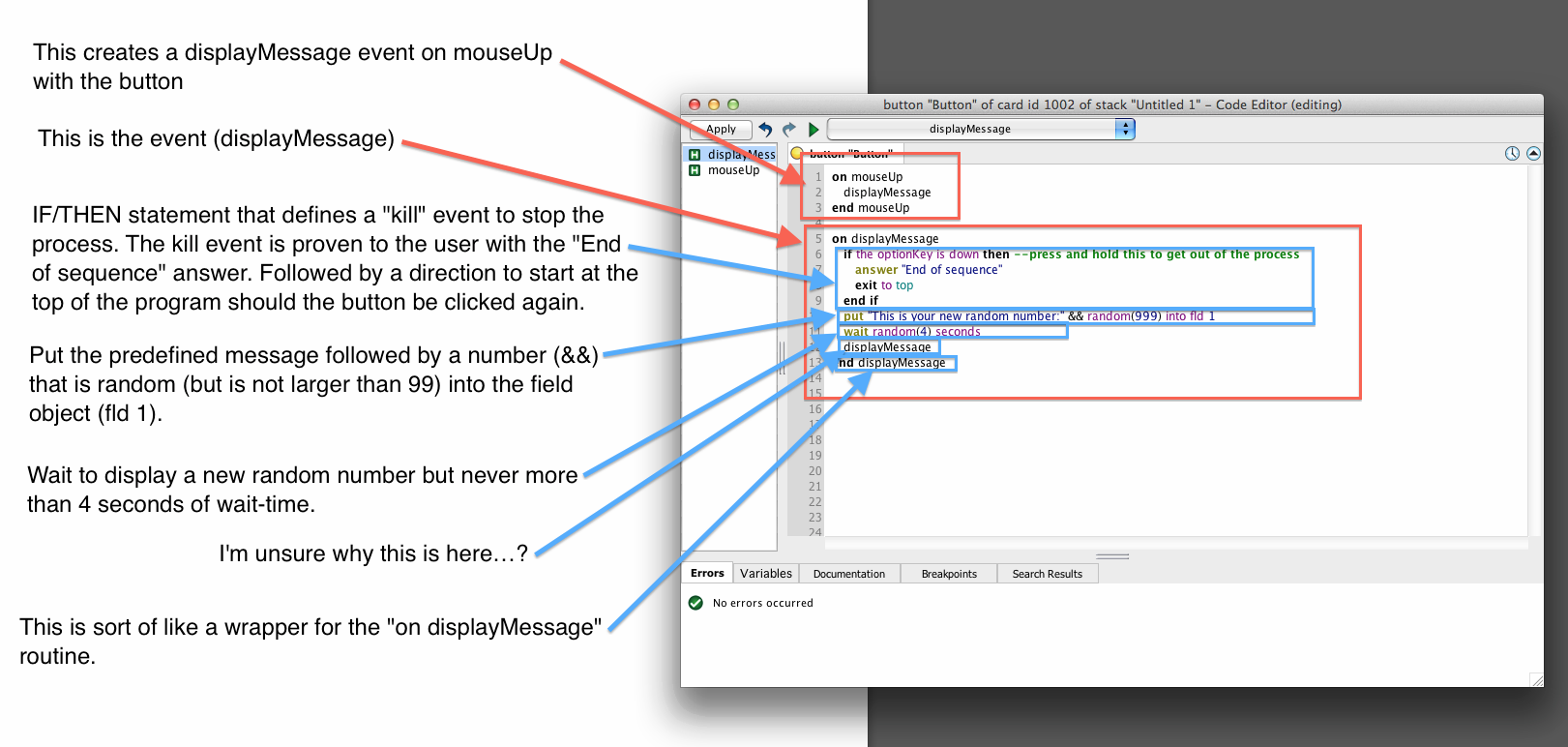 In this case your mouseUp handler generates one displayMessage event which is caught immediately as it is in the same script as the mouseUp. Each time the displayMessage handler is invoked, it should display one random message. So just use the lineSo if we have generated just one displayMessage event with our click, how can we cycle it? We send the same event to the handler again to catch itself. So (as long as you don't end the cycle with your escape check) each time the handler runs, it calls itself just one more timeI hope that helps, I'd answer with a bit more example, but I'm using mobile phone connection on the train atm.