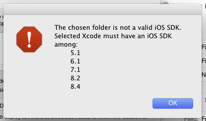 I set the IOS SDK entry to my Xcode application in the applications folder, but it returns the error...