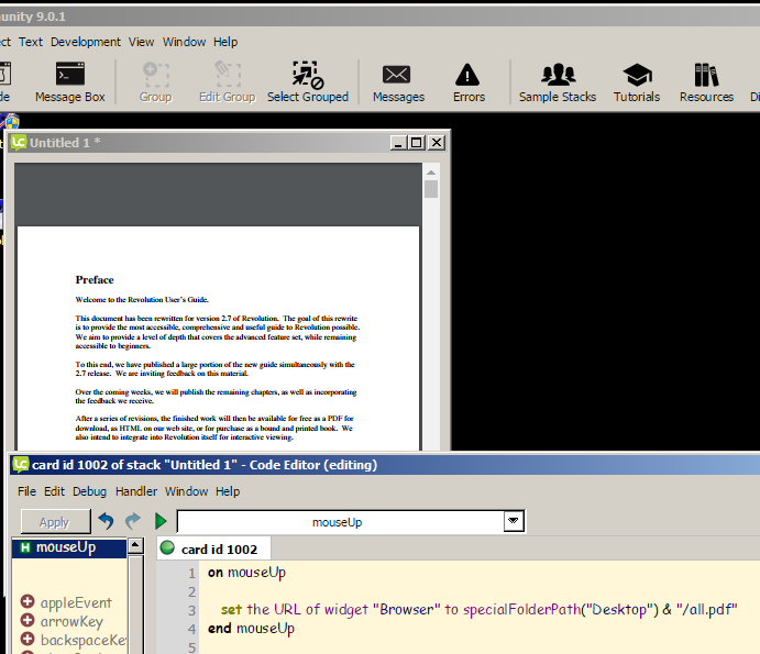 The stack setup is simply a stack with a browser widget, run the 'openStack' handler, click on the stack (where ever the browser aint), and voila. Again, this is on Windows, maybe a difference there.