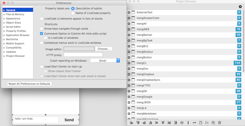 I have found Preferences and I have a choice for the Project Browser to show sections: Front Scripts, Stacks, Back scripts and Stacks in use. I don't yet know what front scripts and back scripts are but that isn't the point here. If I choose "Stacks" I see the whole list of extensions, etc. But if I do not select Stacks and only choose "Stacks in Use", I assume that if I only have one stack in memory, that it will show up, alone, in the list. However, even the stack that is open does not show up for me. Please tell me what I need to do to list only the stack(s) that I am currently working with or rather loaded into memory.