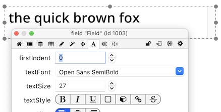 Edit the stack textfont or size. Note no changes in the display of the field inheriting this style. Try to force a screen redraw. Edit the text. Note the field retains the same size/font/style that it was originally created with. The PI still shows inheritance of font with the effective name in italics. Size remains as per the original size at which it was created in the PI regardless of the stack text size setting.