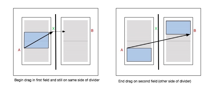 Well I guess in the context of my example (going from the left field to the right) I am selecting the text below the start point of the drag to above the end point in the right hand field.