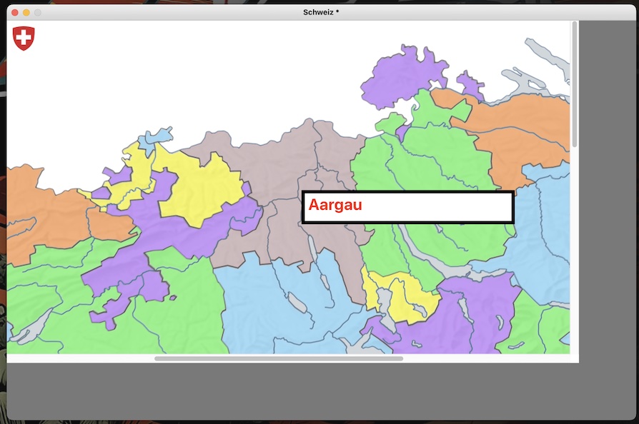 How are you annotating the various regions? I have done this before with multiple transparent freeform graphics that overlie a "base" graphic (Switzerland). I adjust the shape of each so that it outlines a region of interest in the map. Assemble many together to fill the entire map. Best if these overlap each other just a little, so that no user click is made on an "empty" area of the map. If you set the opaque of the graphics and the blendLevel to 100, they will not be visible to the user, that is, the user will only see the map of Switzerland, but their scripts will be triggered when the user clicks on the shape that overlies a certain area.