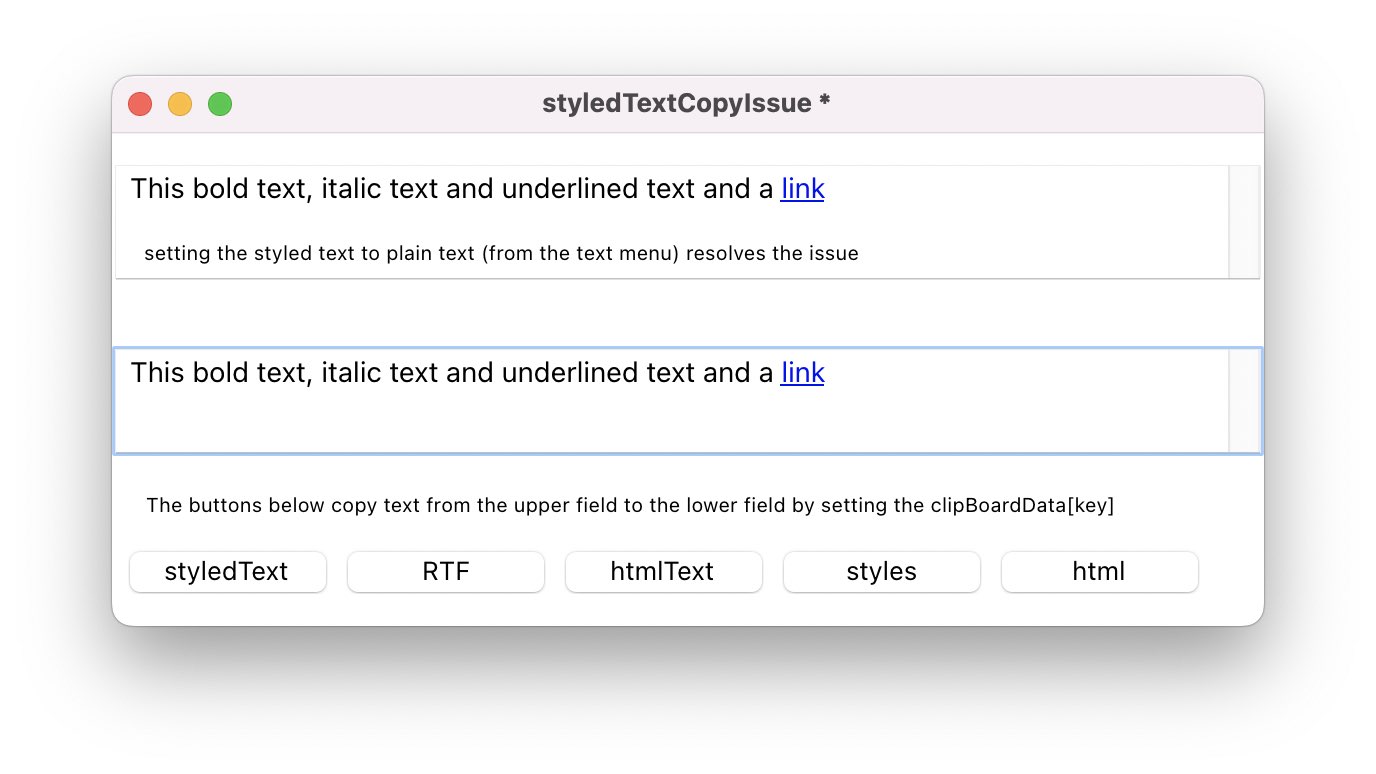 On this note I found that both ["styledText"] and ["htmlText"] fail to copy/paste correctly - all different stylings are converted to a single style, eg if you have a mix of bold, italic and underlined text, all the 'styled' text becomes italic when pasted (unstyled text is unaffected), both when copy/pasting to another field in LC or in a word processor. If you throw in some text at the start of the line and specifically format that text as a 'link' in LC, then all styled text becomes underlined when pasted!